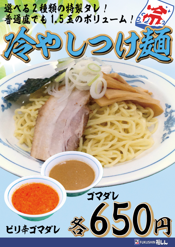 今年も冷やしつけ麺の季節がやってきました!(5/1販売開始) 2026年4月27日 5/1より福しん全店舗にて『冷やしつけ麺』の販売を開始いたします!普通盛りで1.5玉の大ボリュームと、ゴマダレとピリ辛ゴマダレの選べる2種類のタレで大満足な一品です 是非ご賞味ください!